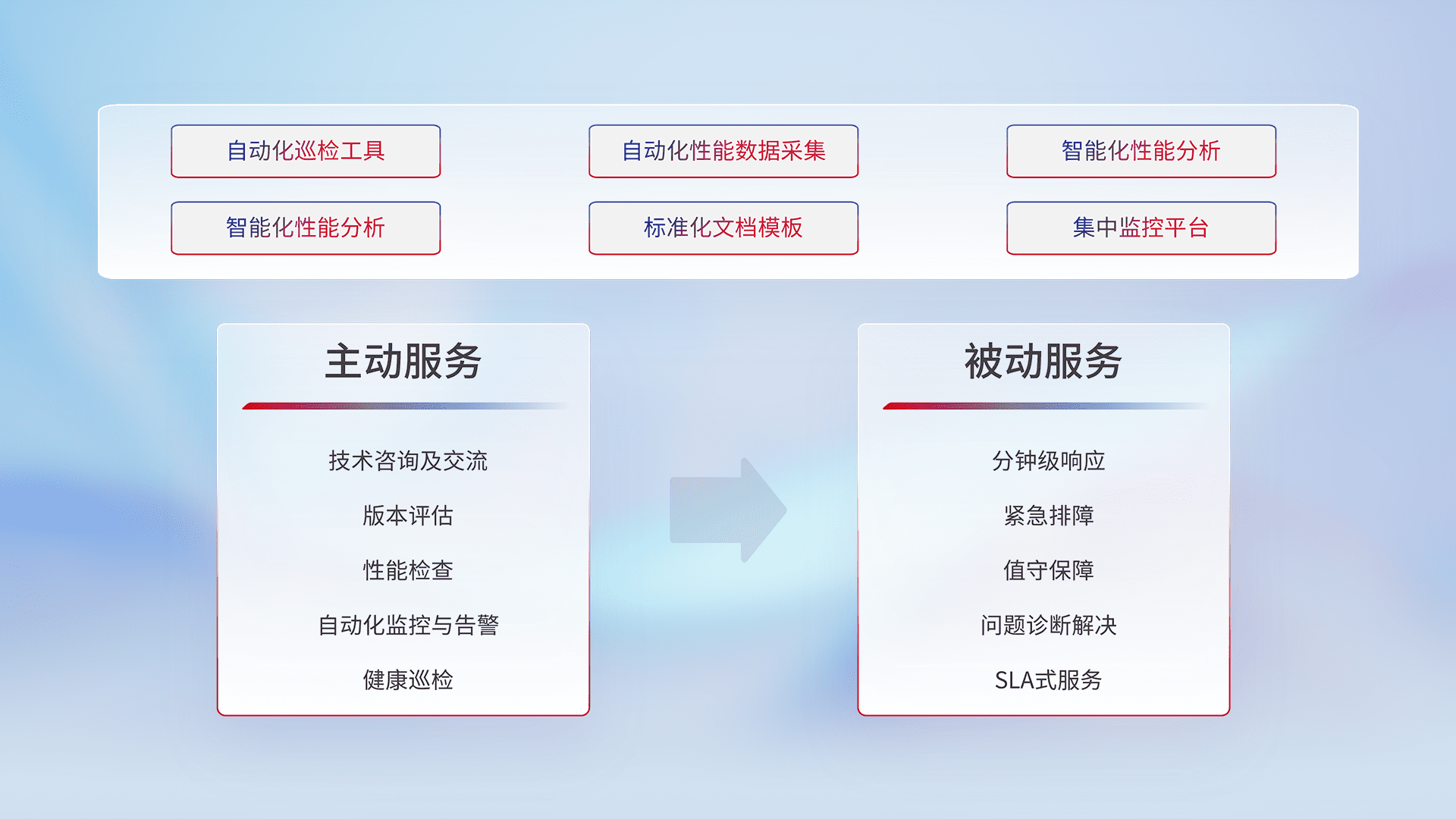 智能化工具和标准化文档,,保障服务质量,,,,提供主动服务(包含技术咨询、、、版本评估、、、、性能检查、、自动化监控与告警、、健康巡检)和被动服务包含(分钟级响应、、、紧急排障、、、、值守保障、、问题诊断解决、、、SLA服务)。。。